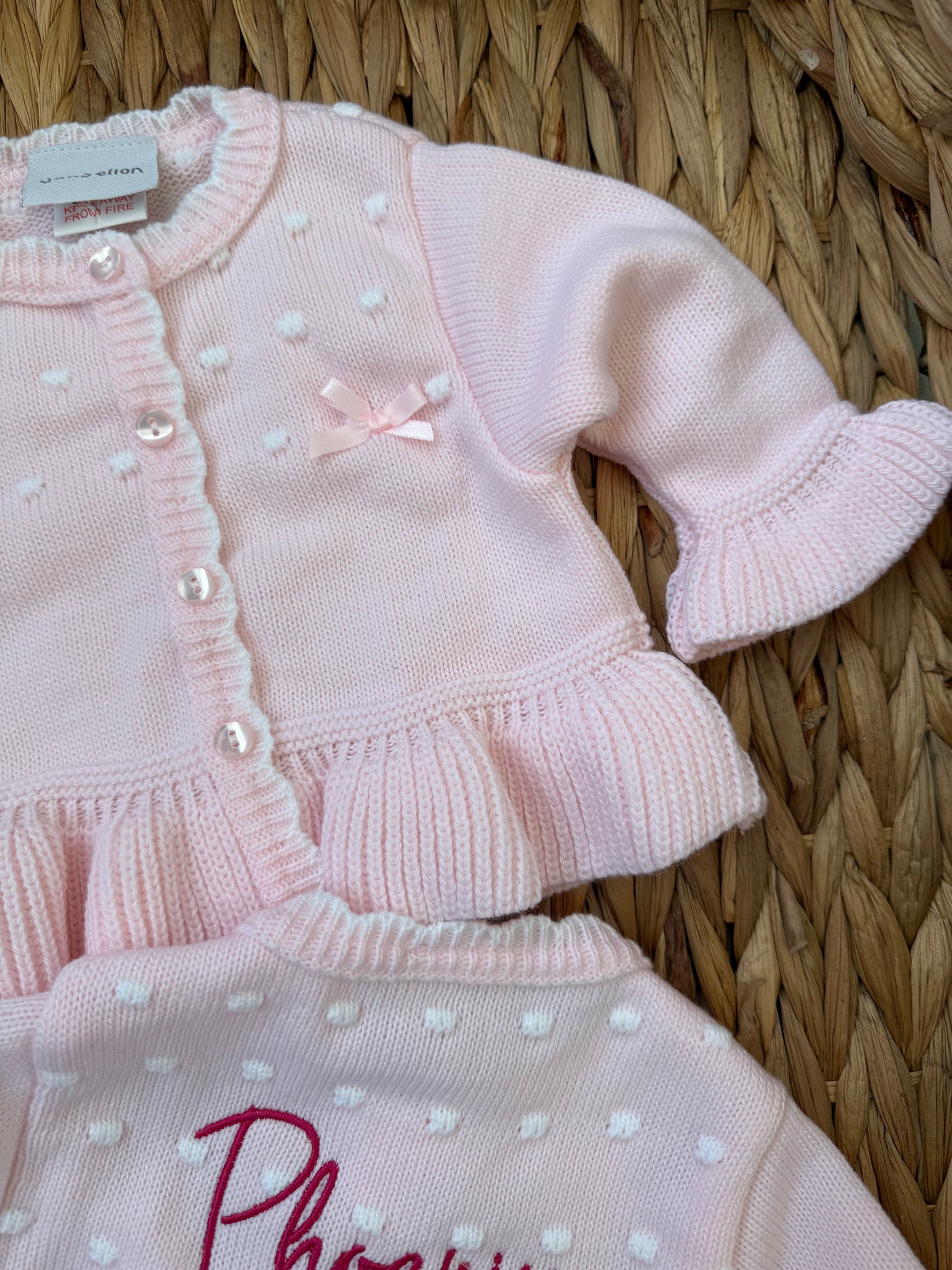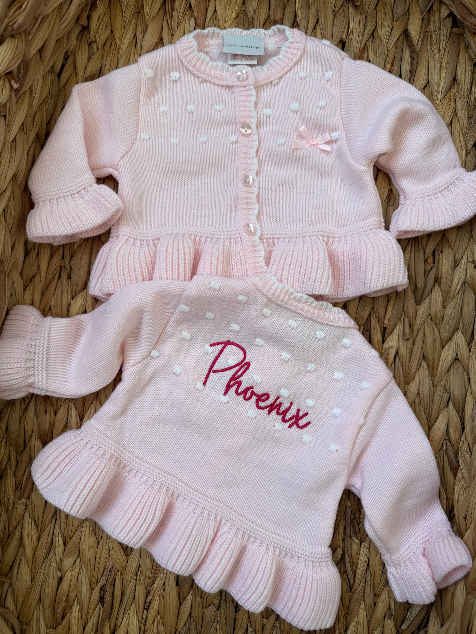 Introduce your little one to timeless elegance with this enchanting ruffle cardigan. Crafted in the softest pink fabric, it features delicate frills and a charming bow detail that captures hearts instantly. Personalise it with your baby's name embroidered in your choice of thread colour, creating a truly one-of-a-kind keepsake. From newborn through 12 months, this is the gift that transforms any occasion into something special—a piece she'll treasure as she grows.